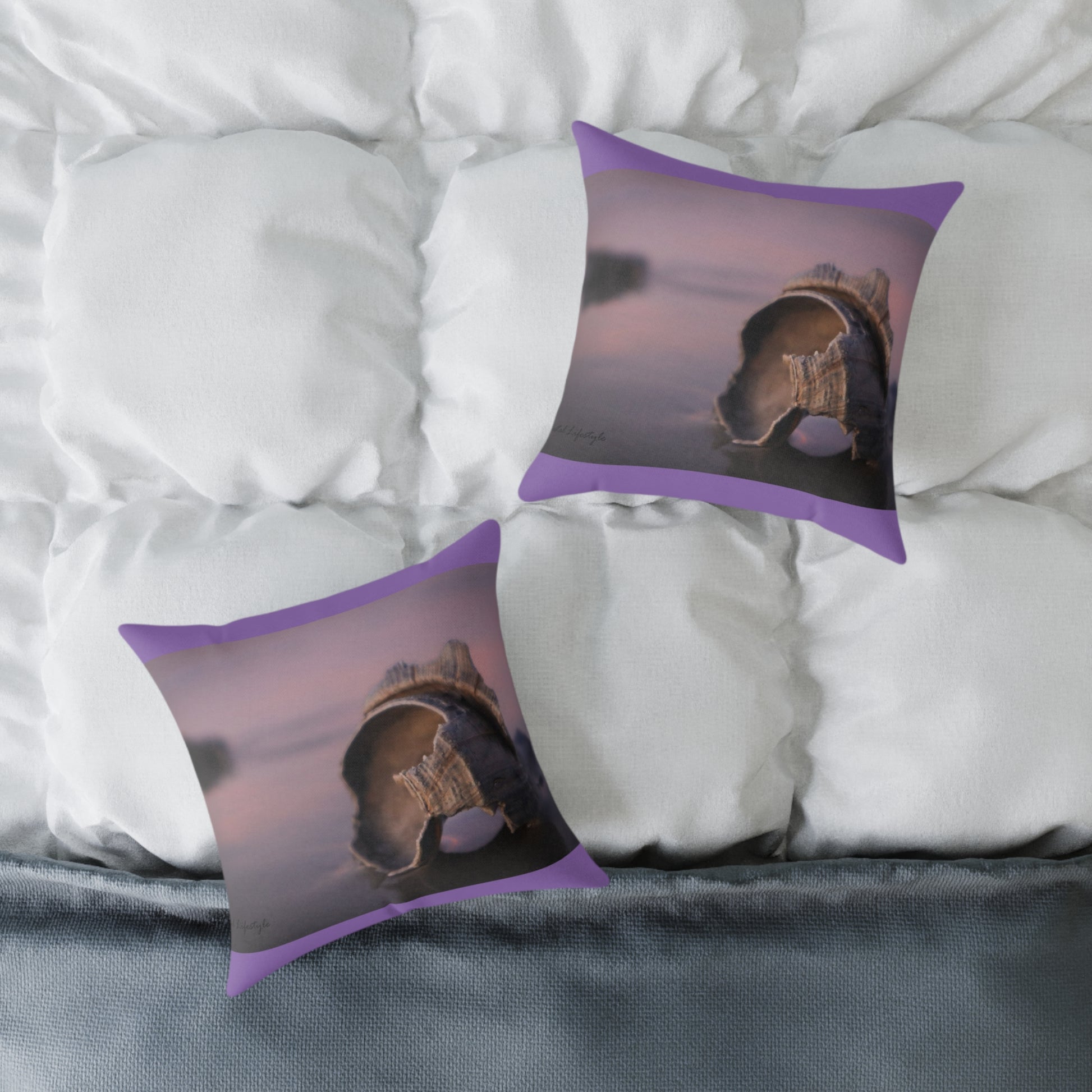 This square poly canvas pillow features a beautiful broken shell on the beach during early sunrise, with vibrant colors ranging from purple to pink. It adds a serene and calming beach vibe to any living space. Perfect for beach lovers, nature enthusiasts, and those who enjoy coastal decor. Ideal for adding a touch of tranquility to your home or beach house decor, especially relevant for summer holidays and beach-themed celebrations.