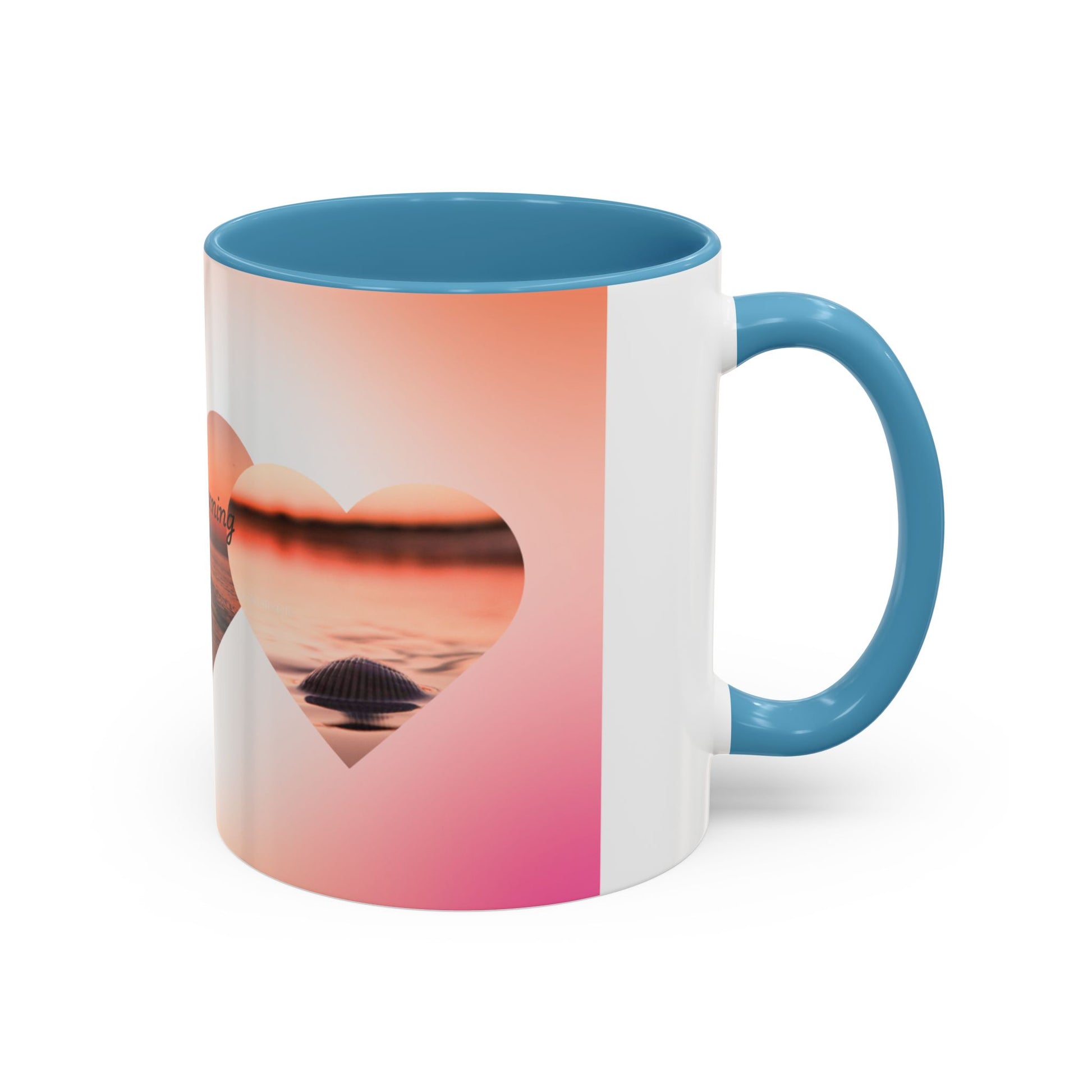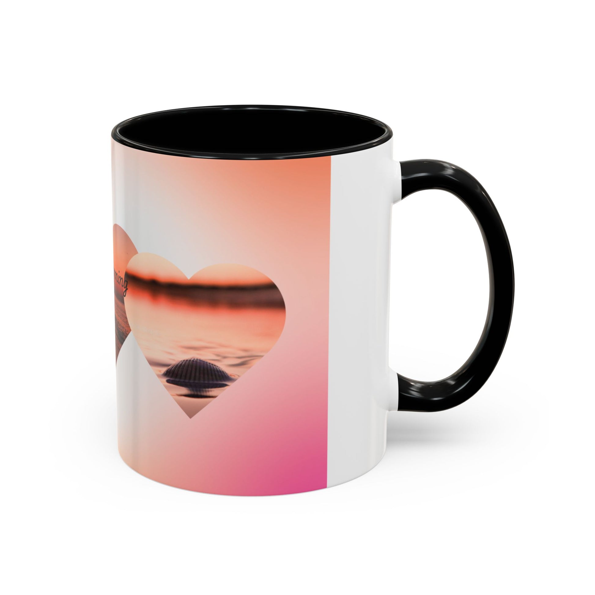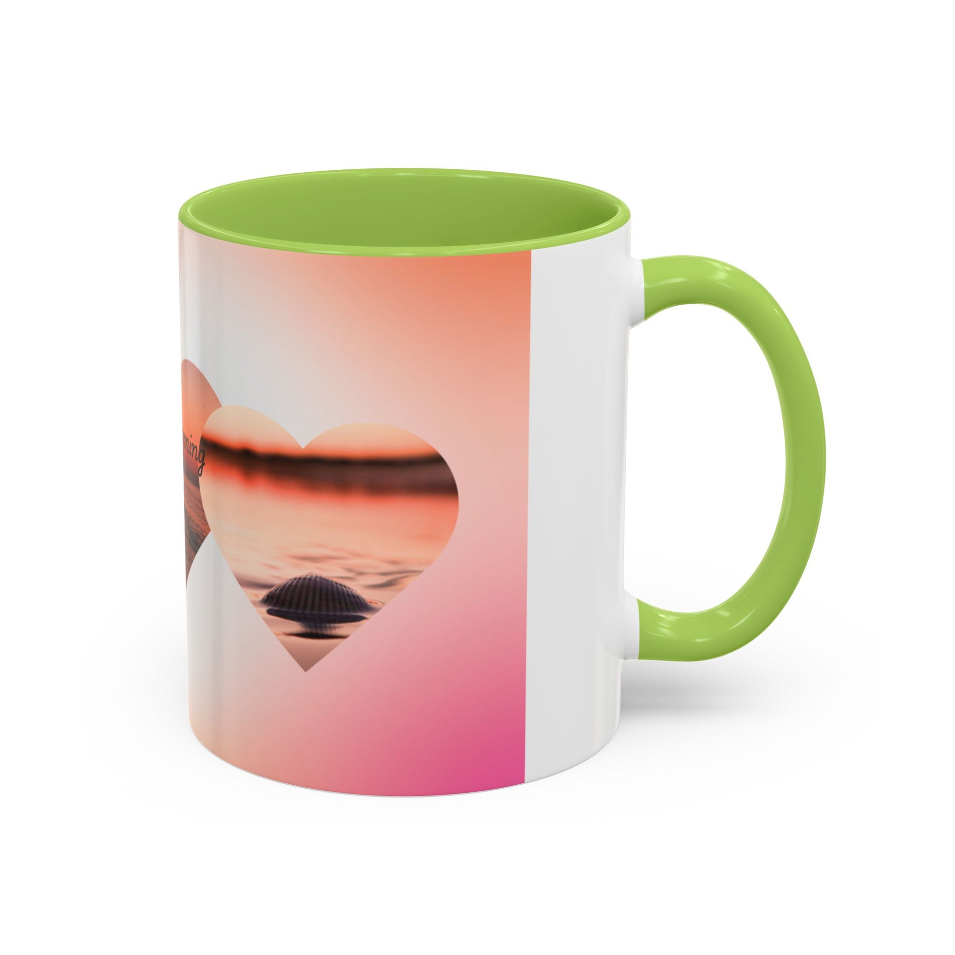 Warm light spills across the rim as you lift this ceramic mug — a slow sunrise captured in soft pinks and honeyed golds. The design wraps in a row of heart-shaped windows that reveal a tranquil shoreline at dawn, the words “Good Morning” drifting across the horizon. It feels like a quiet moment before the day begins: salt air, a low tide, and the calm of early coffee. The colored interior and handle add a little contrast, turning a daily ritual into something quietly celebratory. This mug sits naturally in the hands of someone who savors small routines and mornings by the water — a gentle companion for slow sips and sunrise thoughts.