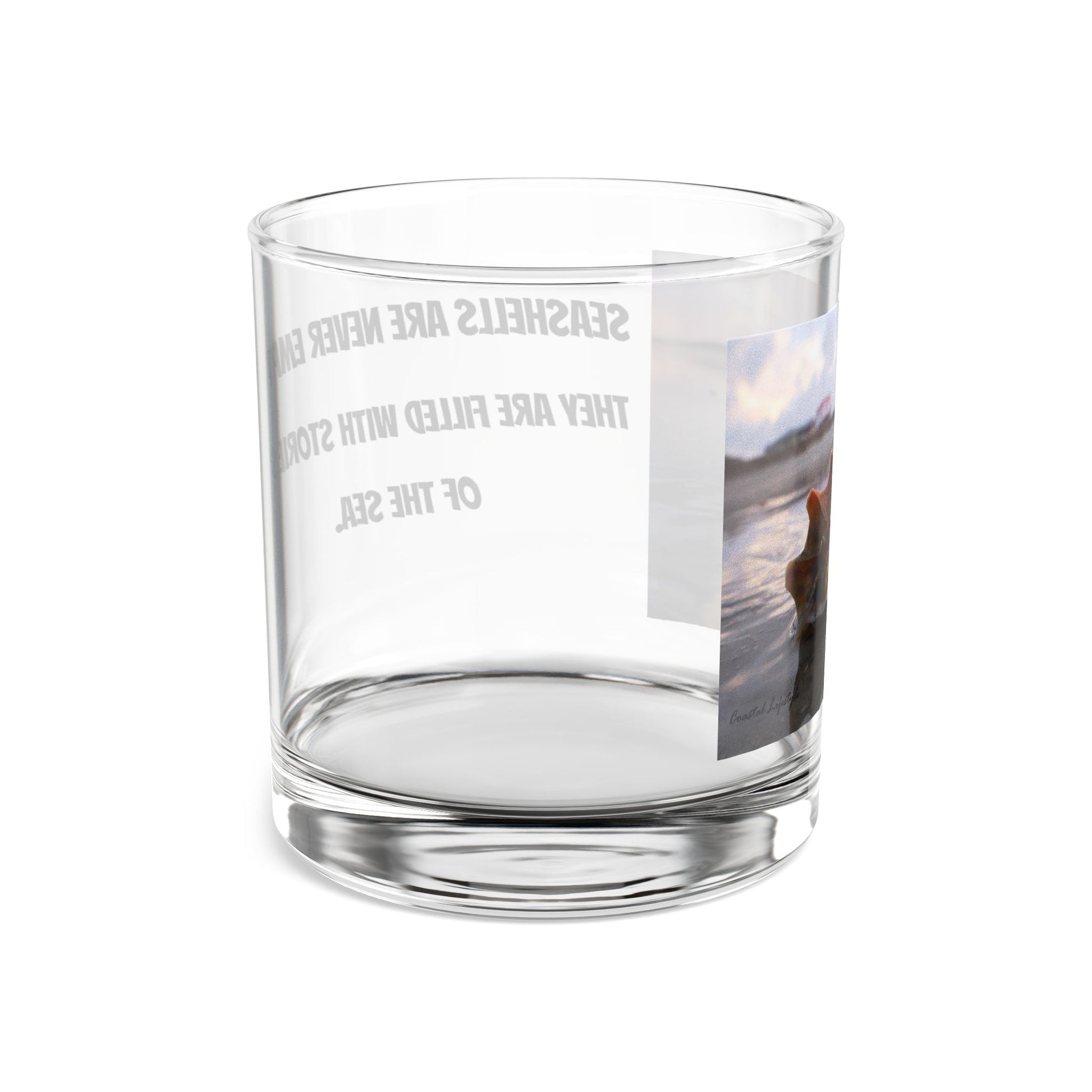Rocks Glass, Seashell Design along a shoreline with sunrise.